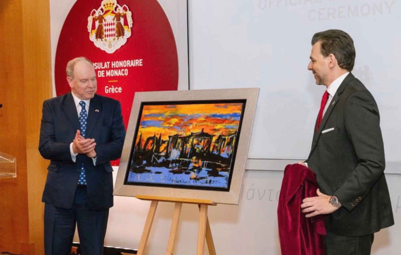 Ένας συμβολικός πίνακας της Μίνας Παπαθεοδώρου-Βαλυράκη με θέμα τον Παρθενώνα προσφέρθηκε στον ηγεμόνα του Μονακό με αφορμή τα εγκαίνια του επίτιμου Προξενείου στην Ελλάδα.