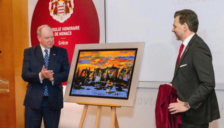 Ένας πίνακας της Μίνας Παπαθεοδώρου-Βαλυράκη με θέμα τον Παρθενώνα προσφέρθηκε στον πρίγκιπα Αλβέρτο Β’ κατά τα εγκαίνια του επίτιμου Προξενείου.