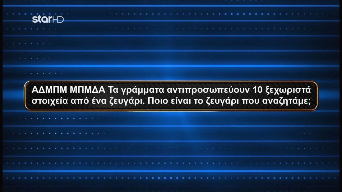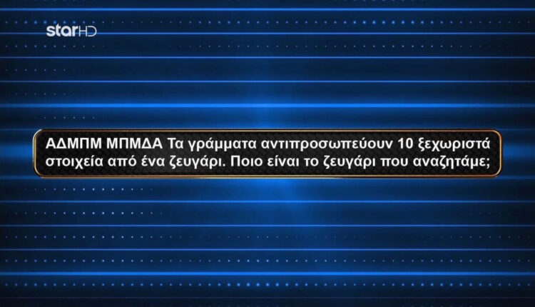 Αφού απέρριψε την προσφορά για 3.000 ευρώ, η Χριστιάνα προχώρησε στην κρίσιμη ερώτηση για το μεγάλο χρηματικό έπαθλο. Η ερώτηση που της τέθηκε ήταν: «ΑΔΜΠΜ ΜΠΜΔΑ: Τα γράμματα αντιπροσωπεύουν 10 ξεχωριστά στοιχεία από ένα ζευγάρι. Ποιο είναι το ζευγάρι που αναζητάμε;».